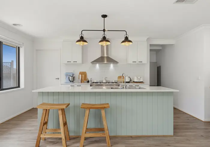 The heart of the home is the stylish kitchen, complete with a walk-in pantry, island bench with feature panelling, striking feature lighting, and a 900mm oven with rangehood—perfect for those who love to cook and entertain.