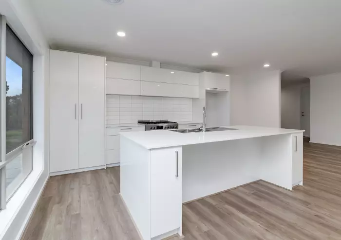 Designed for modern living, the home features a spacious open-plan living zone that flows seamlessly into a stylish designer kitchen complete with Calcutta stone benchtops, a 1200mm island bench, 900mm oven and soft close cabinetry.